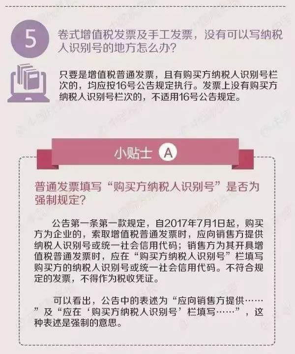 自2017年7月1日起,购买方为企业的,索取增值税普通发票时,应向销售方提供纳税人识别号或统一社会信用代码;销售方为其开具增值税普通发票时,应在“购买方纳税人识别号”栏填写购买方的纳税人识别号或统一社会信用代码。不符合规定的发票,不得作为税收凭证。